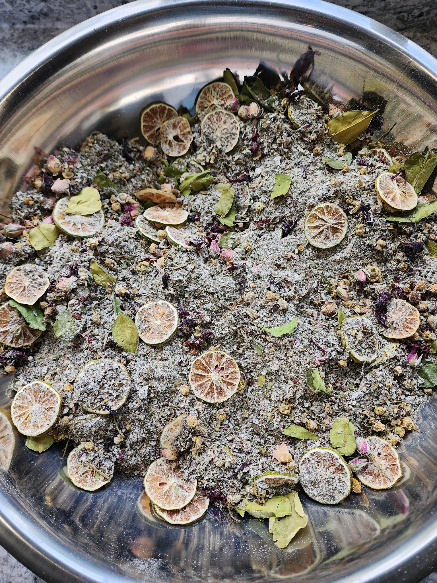 Ingredients: Colloidal Oatmeal, Himalayan Salt, Coconut Milk, Raspberry Leaves, Lemon Balm, Nettle Leaf, Lime Blossom, Lime Slices, Dandelion, Chamomile, Roses, Hibiscus, Allantoin.